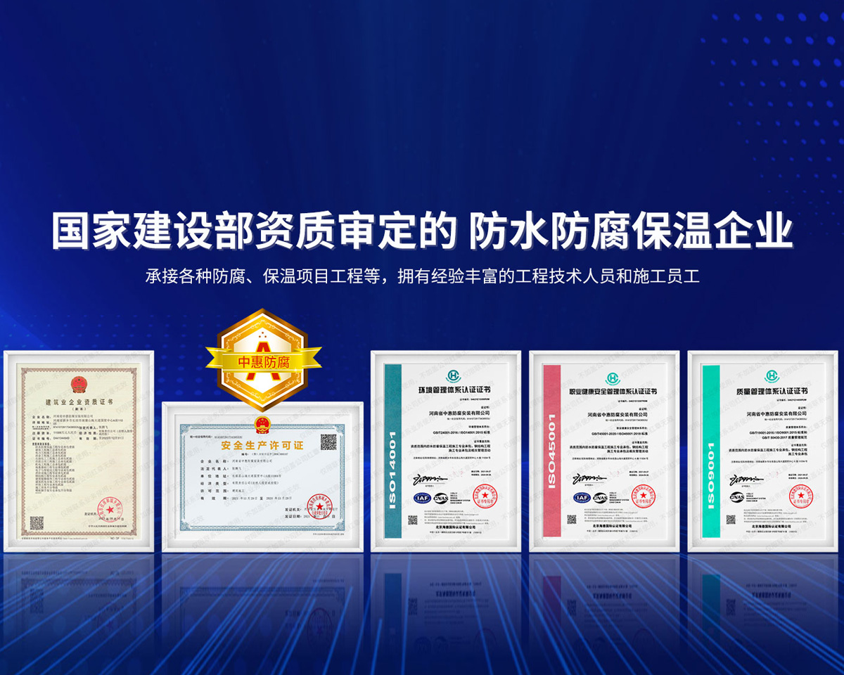 公司經營范圍:防水防腐保溫工程;消防設施工程;建筑裝修裝飾工程;建筑機電安裝工程;電力工程;建筑工程;石油化工工程;工業清洗工程;油罐清洗工程;鋼結構工程;環保工程;模板腳手架工程;電纜防火封堵、防污閃噴涂、外墻外保溫工程;各類施工勞務作業;設備維修、船舶鉚焊、涂裝;電力工程材料、建材、防水材料、防火材料、防腐保溫材料銷售,并相繼通過了GB/T19001-2008idtISO9001:2008GB/T50430-2007質量管理體系認證證書。GB/T24001-2004idtISO14001:2004環境管理體系認證證書。GB/T28001-2011idtOHSAS18001:2007職業健康安全管理體系認證證書。公司是中國防腐蝕于防護協會、中國施工企業管理協會、電力協會和中國鋼結構防水協會會員單位。 公司的經營業務涵蓋了石油、化工、電力、冶金、煤炭、船舶、國防、燃氣、水利、環保、交通運輸、航空及國防軍工和輕紡市政等行業的防腐保溫絕熱設備。鋼結構安裝、防火、防水、金屬噴鍍、聚脲噴繪、陰極保護、防滲透堵漏、玻璃鋼及各種磚版材料襯里、橡膠襯里、煙氣硫和耐酸溶劑腐蝕等工程施工。公司連續十年榮獲“省市先進施工企業”“安全生產先進單位”“重合同,守信用企業”和“AA***資質企業”的稱號。2000年被命名為市級文明單位,2002年被國家工商行政管理局命名為“重合同,守信用的企業”、被中國工業防腐蝕技術協會命名為“防腐蝕企業,能源節約及環境保護領域有豐富的經驗和***的業績。工程一次交驗合格率100%。其中攀枝花鋼鐵公司煉鐵廠四號高爐及熱風爐防腐工程、上海寶鋼公司煤氣柜防腐工程、撫順石油一廠裝置防腐項目、齊魯石化公司稀烴廠高塔防腐工程、吉林化學工業公司煉油廠油罐防腐工程、天津石化熱電廠六號爐頂棚聯絡管保溫工程、大慶油田(太倉)力神泵業工程、中國化學工程第十一建設工程、中原油田勘探局工程、中國石化銷售有限公司華北分部、魯皖輸油管道工程、貴州開磷息烽合成氨工程、陜西黃陵煤化工程、中國石油天然氣西部管道塔里木輸油工程、邯鋼集團邯寶鋼鐵公司煉鐵工程、德州供電工程、吉寶(南通)船廠工程,偃師華潤熱力工程、鄭州熱力總公司。 河南省中惠防腐安裝有限公司愿以豐富的施工經驗,***的技術,***的設備,***的管理,***的服務,竭誠為國內外廣大的用戶提供***滿意、******的工程作品。 我公司愿與國內外同仁一道,團結協作,共同推進防腐蝕行業發展! 公司地址:河南省長垣縣建設路北段360號 固定電話:0373-8866488 郵編:453400 網址:http://www_zhff_com_cn.schzp.com